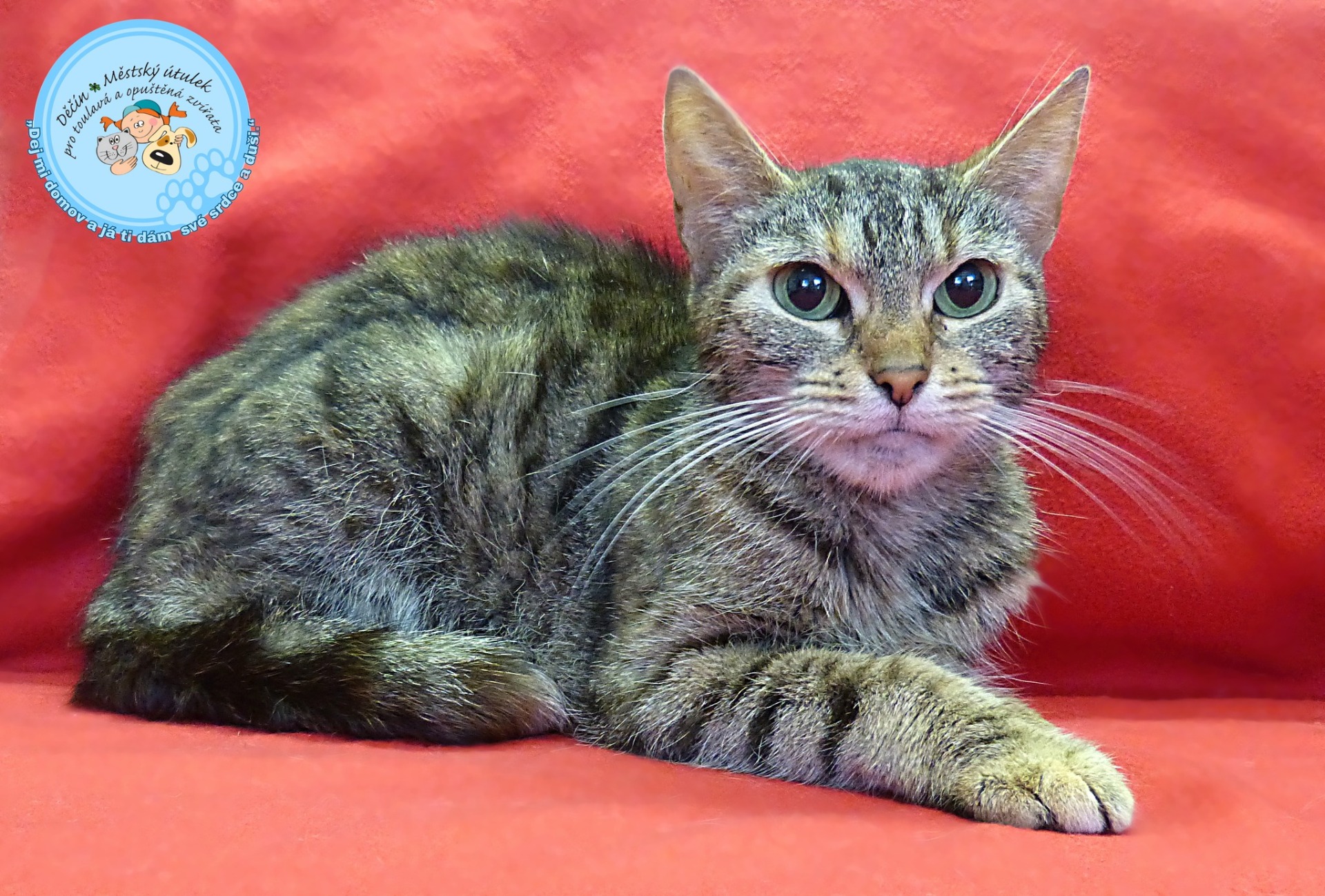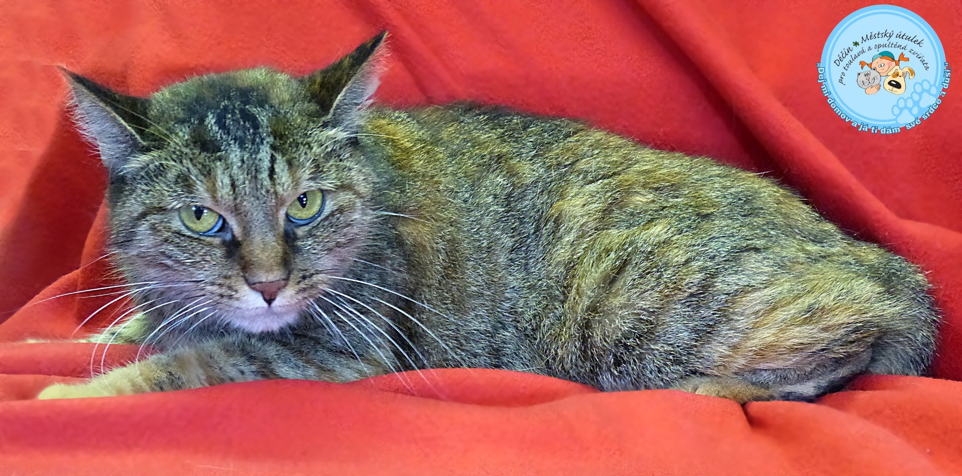 je zelenooká kráska, která byla nalezena 5.9.2025 v Děčíně - Boleticích. Je vyhublá, potřebuje dohnat formu. Je moc milá, hodná a klidná. Odhadem jí jsou 4 roky.